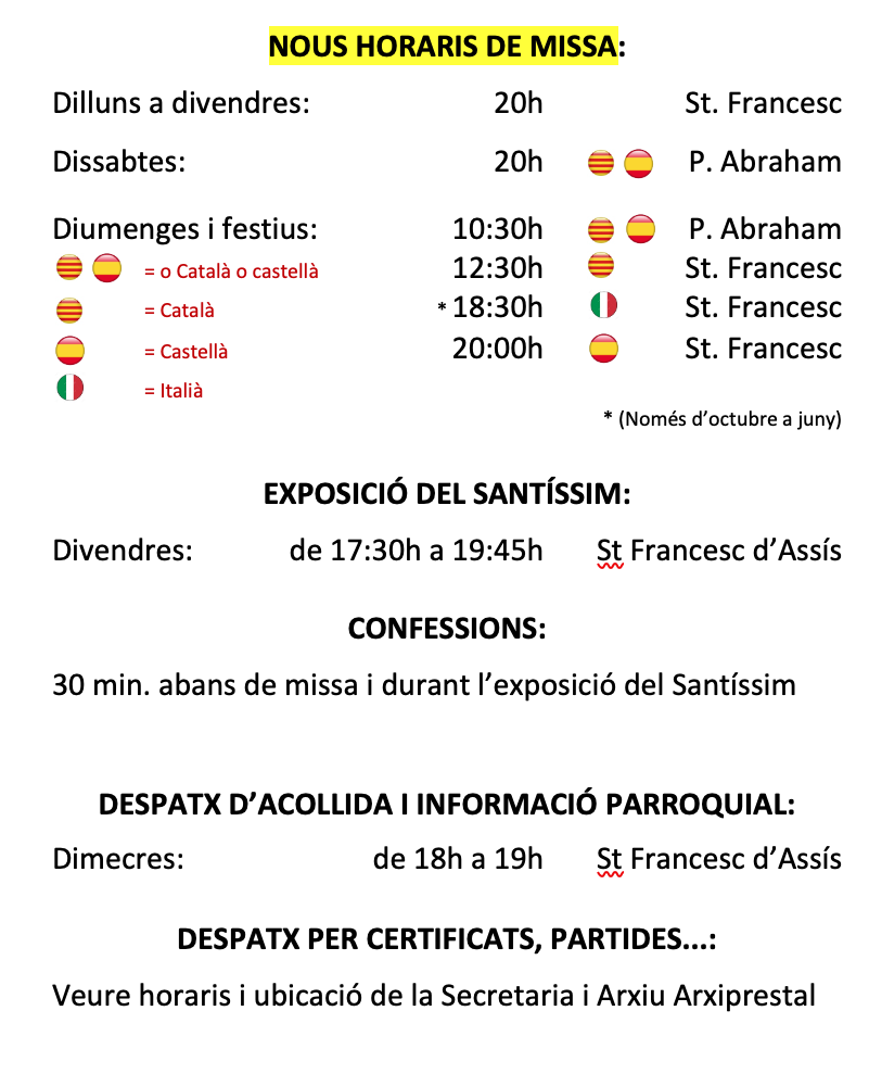 Tots els divendres, de 17:30h fins a la missa de 20:00h, l'església parroquial de Sant Francesc d'Assís romandrà oberta per a exposar el Santíssim per a la seva pública adoració. Els fidels que ho necessitin podran confessar-se durant aquest temps.